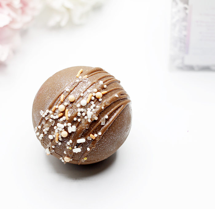 Une bombe en chocolat MAGIQUE de couleur pêche, au chocolat blanc, qui explose au contact de lait