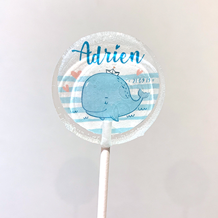 Sucettes personnalisées rayé façon marin avec une baleine toute mignonne.