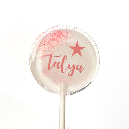 Sucettes personnalisées avec fond rose clair effet aquarelle et une petite étoile.