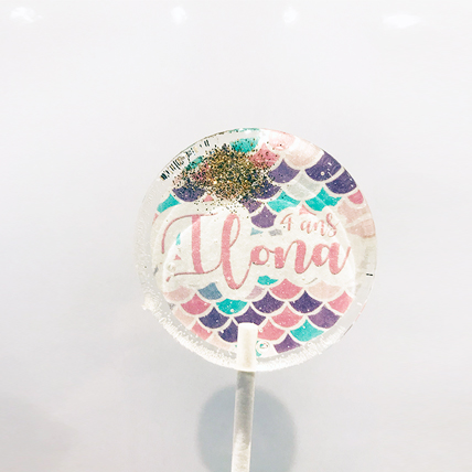 Sucettes personnalisées thème sirène avec écailles dans les tons violet, turquoise et rose.