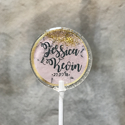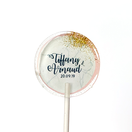 Sucettes personnalisées fond marbre rose, contour effet or.