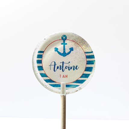 Sucettes personnalisées thème marin à rayures bleu et blanches et une ancre !