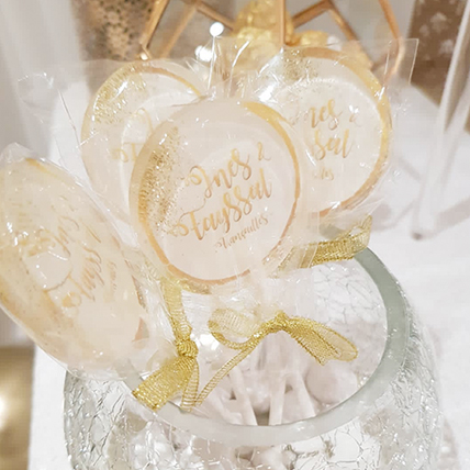 Sucettes personnalisées idéales pour les mariages aux couleurs blanc et or.