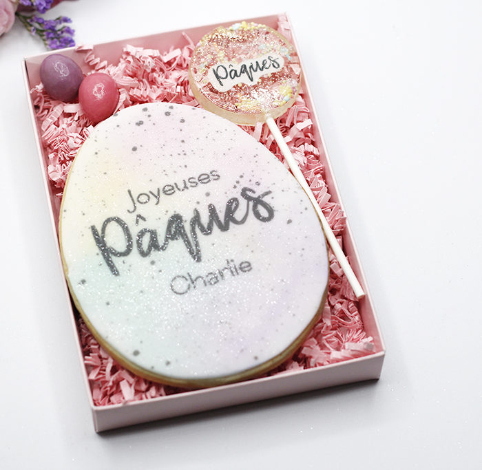 – 1 gros sablés en forme d’oeuf aux teintes dégradées de couleurs pastels, avec prénom personnalisable