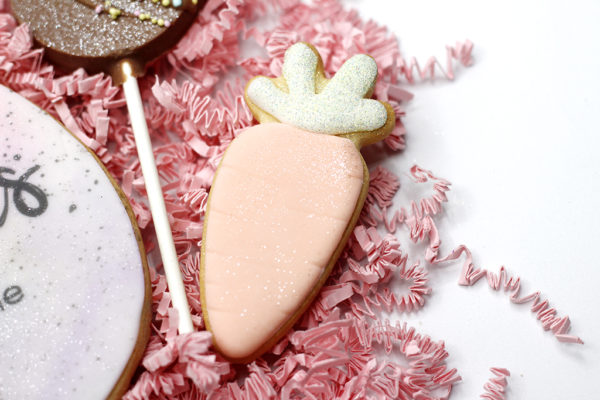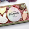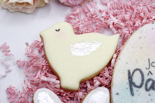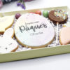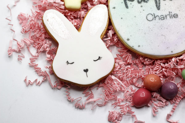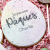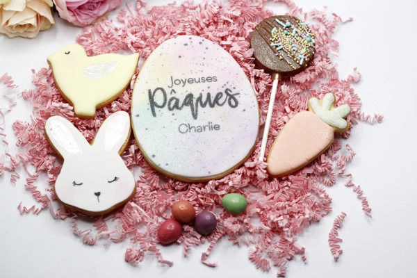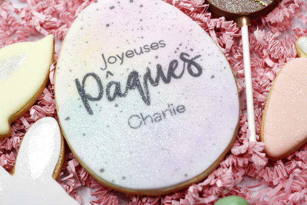 – 1 gros sablés en forme d’oeuf aux teintes dégradées de couleurs pastel, avec prénom personnalisable