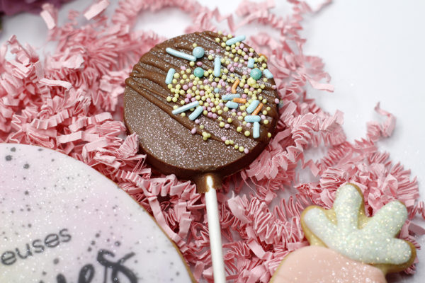 Sucette : chocolat au lait Cacao Barry, perles colorées