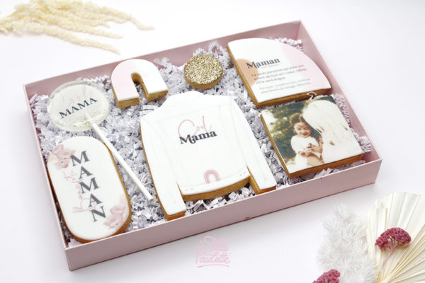 Le coffret comprend 6 pièces, dont 1 sucette et 1 sablé à personnaliser.
