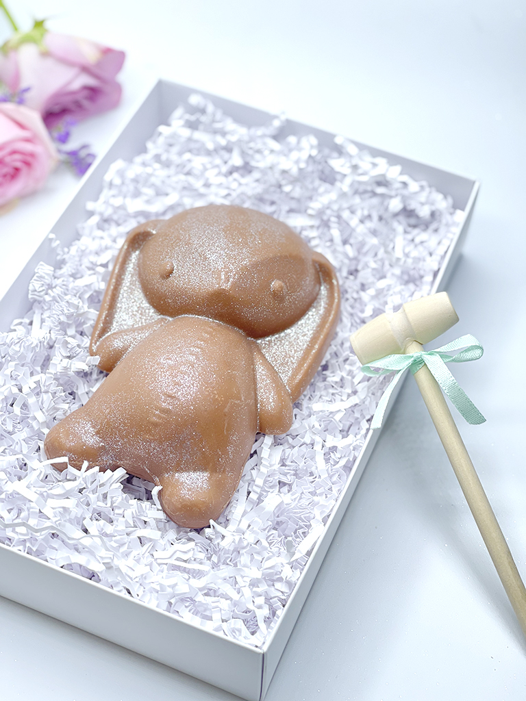Un doudou lapinou en chocolat à casser, qui explose pour délivrer pleins de minis bonbons et petits chocolats…